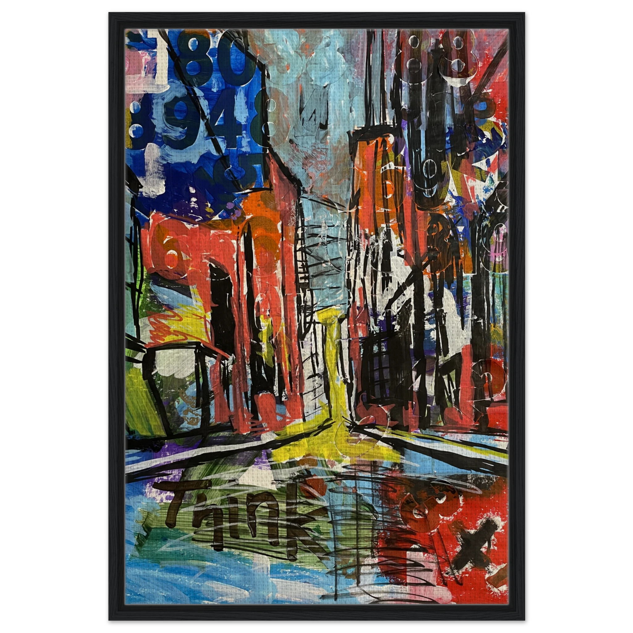 Anthony Vade’s abstract landscape painting, “Happiness is Just a Number,” is a vibrant study of a New York City alleyway. The painting is a riot of color, with bold reds, blues, greens, yellows, and blacks jostling for attention. The brush strokes are wild and rhythmic, creating a sense of movement and energy that captures the frenetic pace of city life.
