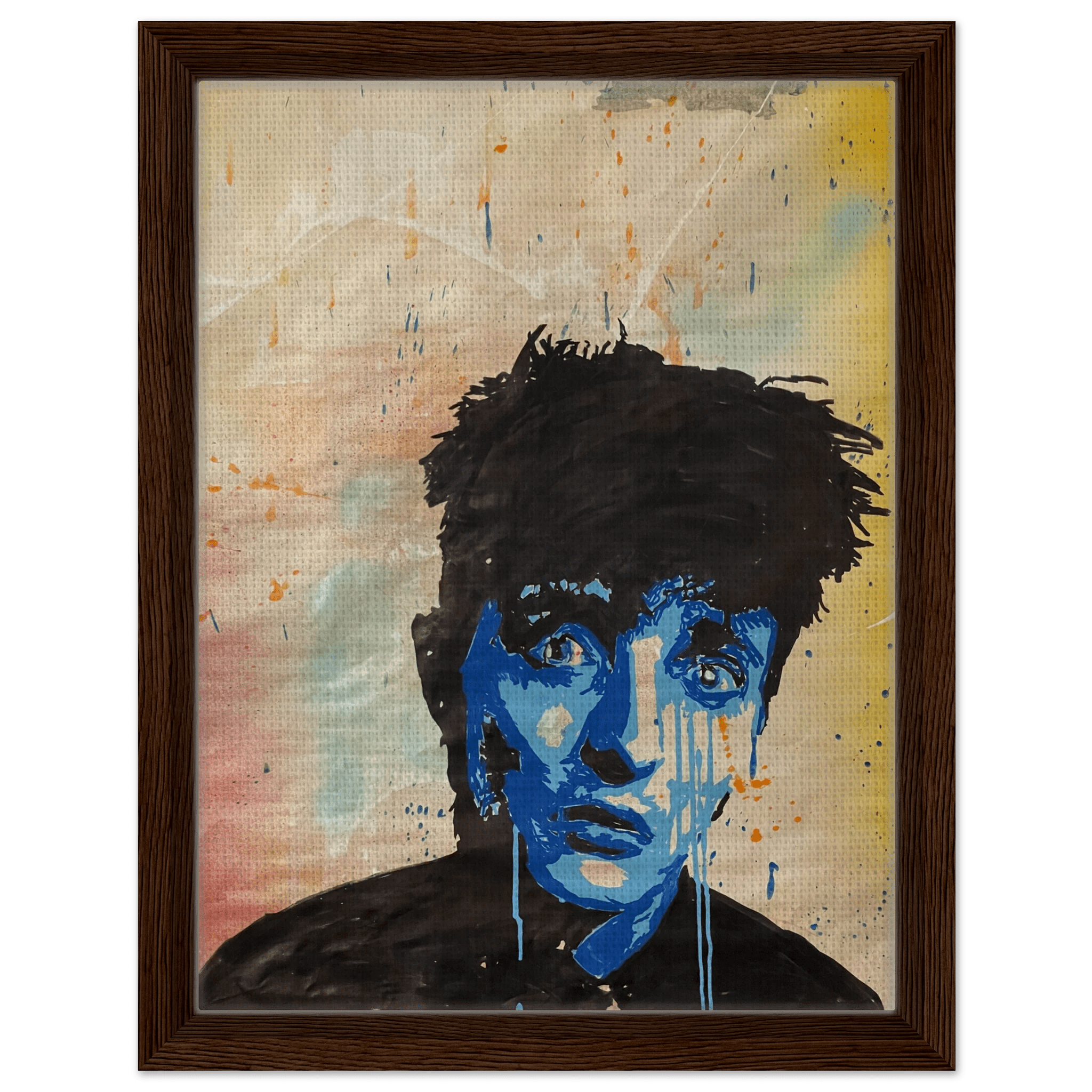 This striking abstract portrait of Rowland S. Howard, part of a quadriptych series, pays homage to the members of the seminal Goth Punk band The Birthday Party, encapsulating their raw energy and dark mystique. Each panel highlights a distinct band member, rendered in bold, angular strokes and an expressive palette that merges vibrant blues with a golden-yellow backdrop.