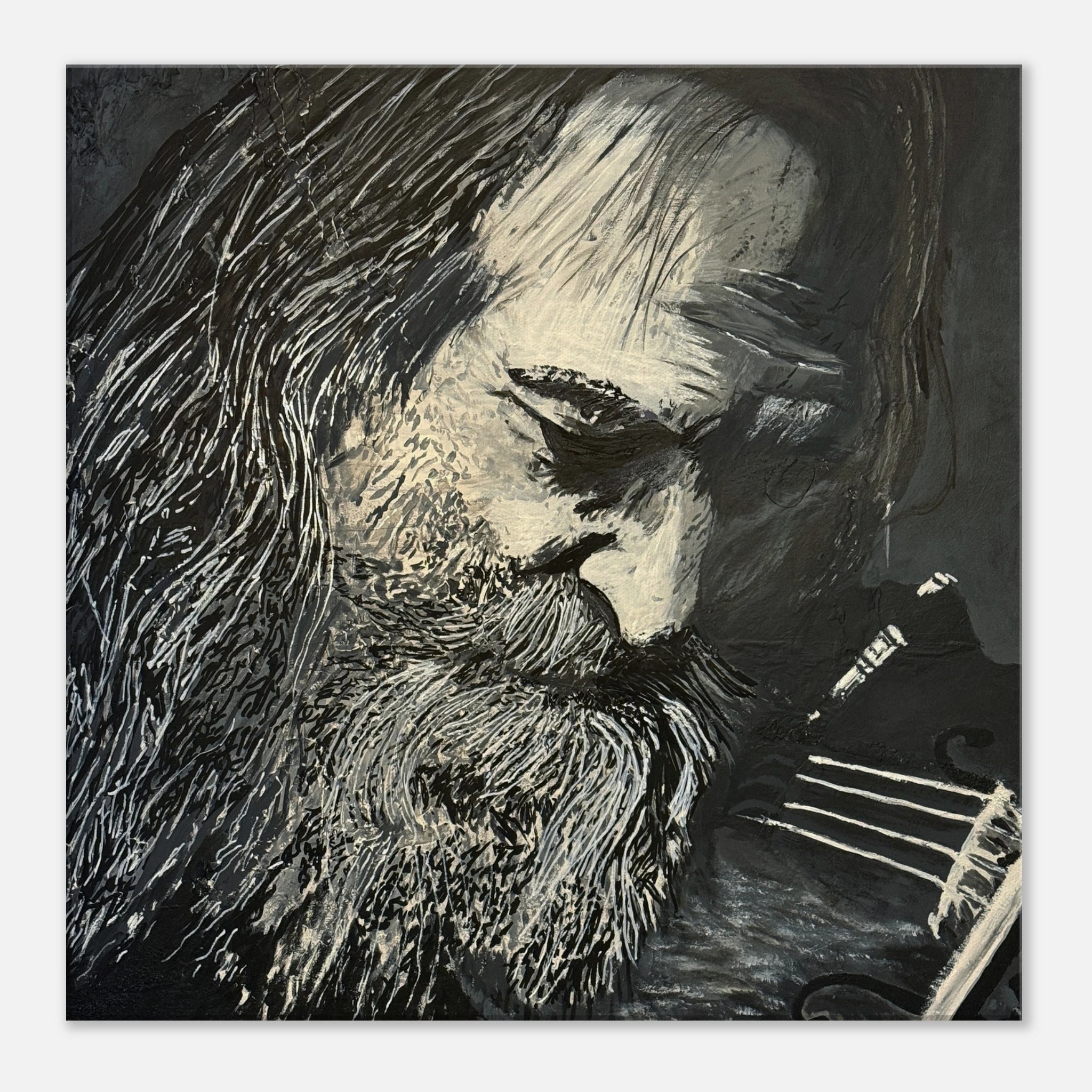 Own a piece that truly breaks the fourth wall. This stunning, high-contrast portrait by artist Anthony Vade captures the raw, kinetic energy of legendary musician Warren Ellis (Nick Cave & The Bad Seeds, Dirty Three). The expressive, textural style perfectly conveys the intensity of Ellis mid-performance. But the art doesn’t stop at the canvas. The […]